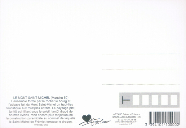 フランス西海岸、サン・マロ湾上に浮かぶ小島に築かれた修道院でカトリックの巡礼地のひとつである世界遺産「モンサンミシェルとその湾」のポストカードです。