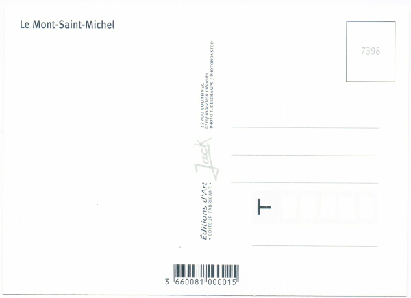 フランス西海岸、サン・マロ湾上に浮かぶ小島に築かれた修道院でカトリックの巡礼地のひとつである世界遺産「モンサンミシェルとその湾」のポストカードです。